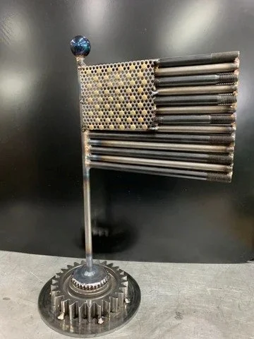 Some of our favorite pieces from Apple Girl Art include the business card holder, Ol’ Glory, and the wrench ring. In addition to the items that are always available, custom pieces can be ordered, past pieces that include trophies, man cave centerpieces, and custom art. Purchases can be made directly from the Apple Girl Art website (link below) and can be seen on Instagram.