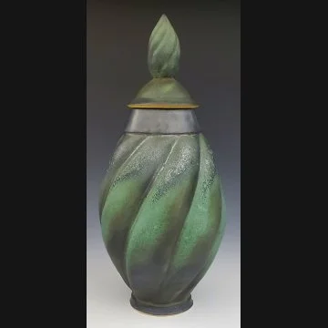 K.M. Pottery’s Small Twisted Vessel is thrown on a wheel before having the shape manipulated, carved, and spray glazed to end up with this beautiful piece.