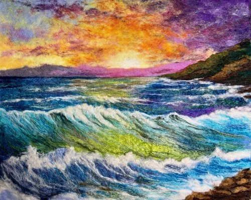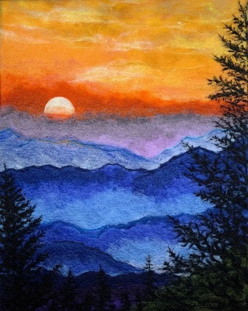 Using felt, Laura produces captivating scenes, primarily focused on nature scenes. The material provides some relief which is increased through her use of layering and Laura will occasionally make the art extend in front of the picture matting, really making it pop out from the wall. I particularly enjoy the scenes that Laura makes with water as well as night skies.