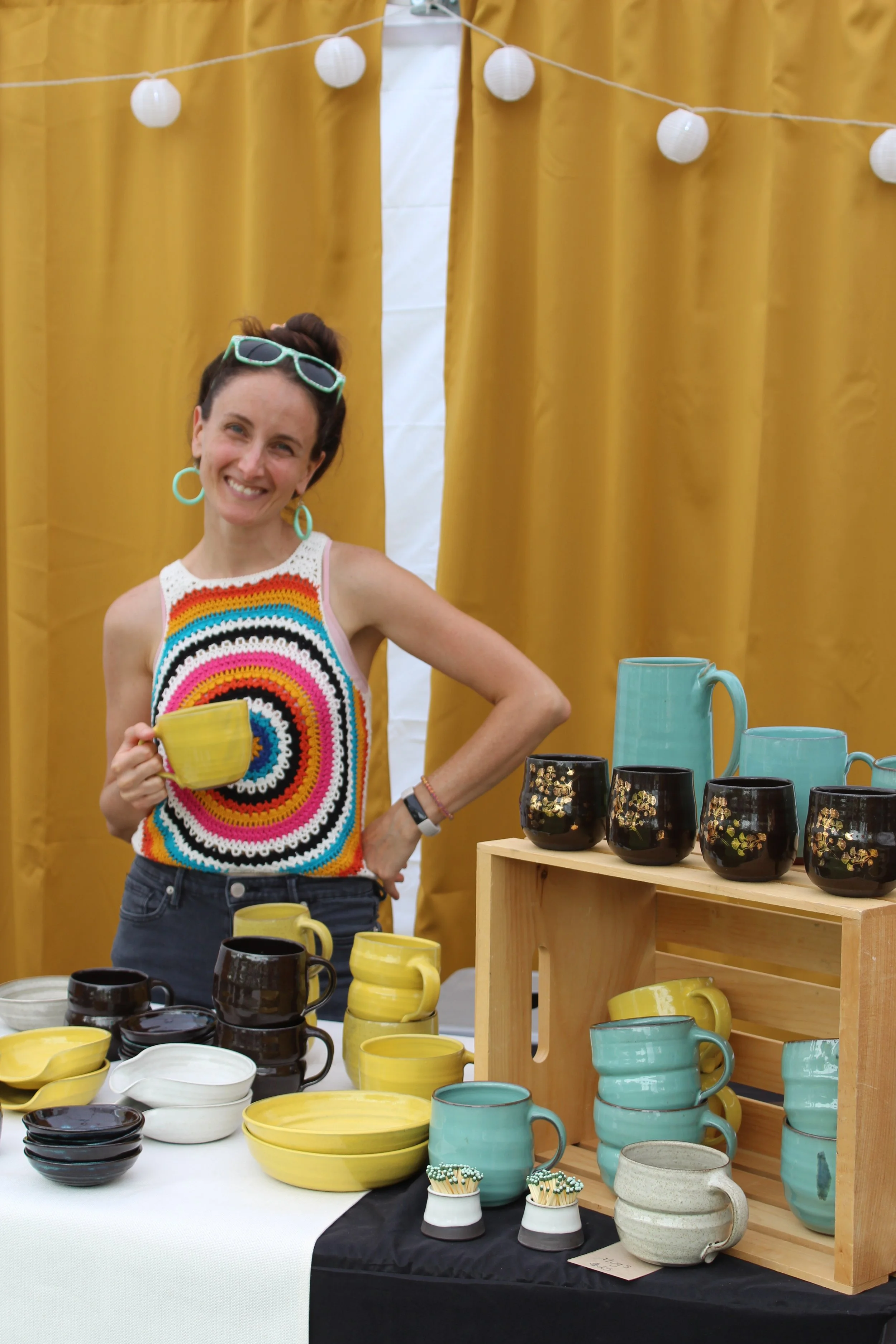 The shapes and colors displayed in Mimeo Tableware’s booth are the signature style that will draw you in. Sarah makes her own glazes from scratch, ensuring consistent colors that you won’t find elsewhere, and the consistency from piece to piece allows you to build a matching set of dinnerware. One of Sarah’s most popular pieces is the garlic jar (below). As with many artists, this design started as a product request that has become a mainstay in the Mimeo Tableware lineup and seamlessly blends functionality with beauty that is impossible to replicate outside of a handmade piece of art.